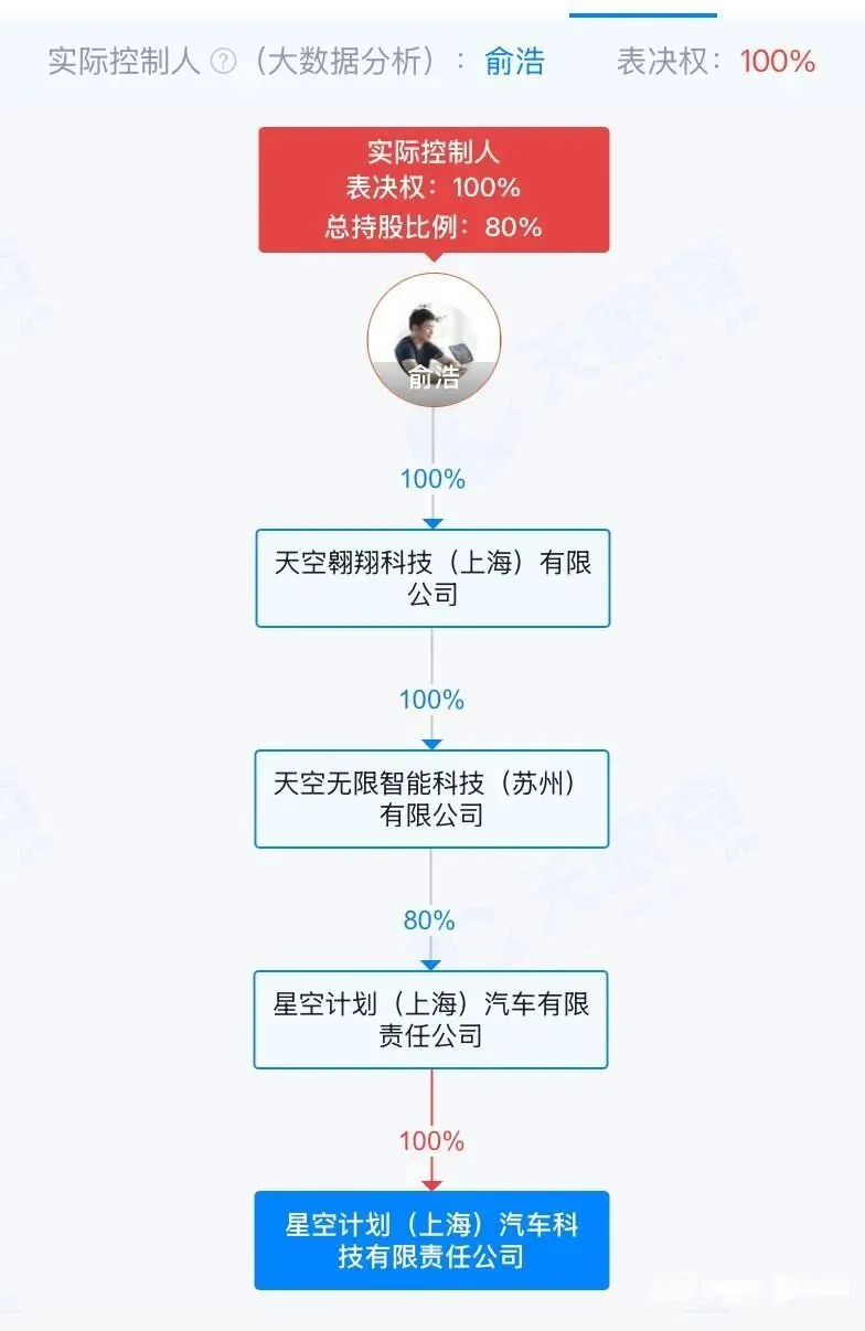 而星空汽车则是追觅投资孵化的子公司,对标库里南、宾利的车型或者将在此诞生。天眼查显示,星空计划(上海)汽车科技有限责任公司注册资本为10亿元,总部位于上海临港新片区,俞浩通过三家公司间接持股80%,为公司最终受益人和实际控制人。
