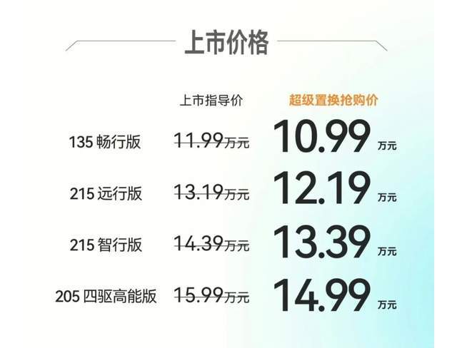 咱们看看这四款车型的差异,畅行版、远行版、智行版、高能版,顶配没必要说了,预算到了肯定就是四驱车型,没啥好讲的。如果是在剩余的三款中来选择,咱们对比下优劣。