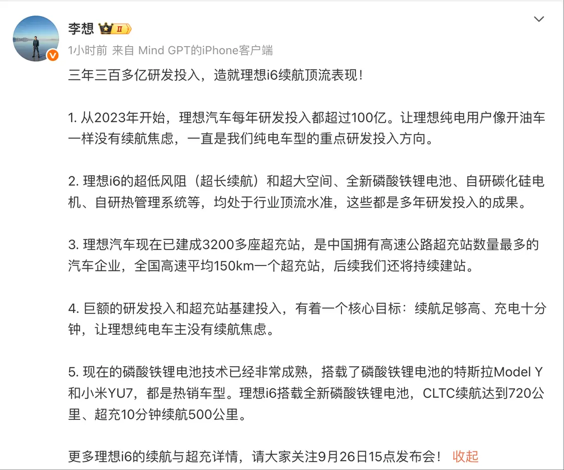 9月24日,理想汽车ceo李想发文称,“三年三百多亿研发投入,造就理想i6续航顶流表现”。